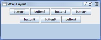 In the following example, the button panel was added to the north of a BorderLayout and the blue panel added to the center. You use the WrapLayout the same as you would use the FlowLayout: